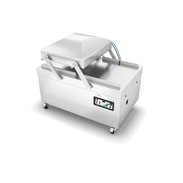 Dubbelkamer vacuümmachine met extra lange sealbalken. De externe zuigbuis zorgt dat er naast lengte ook meer ruimte is voor het plaatsen van producten. Ideaal voor het industrieel verpakken van grotere producten.