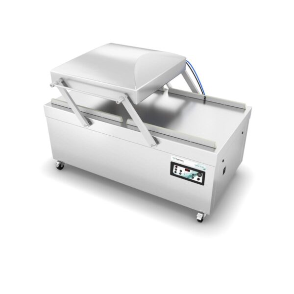 Dubbelkamer vacuümmachine met extra lange sealbalken. De externe zuigbuis zorgt dat er naast lengte ook meer ruimte is voor het plaatsen van producten. Ideaal voor het industrieel verpakken van grotere producten.