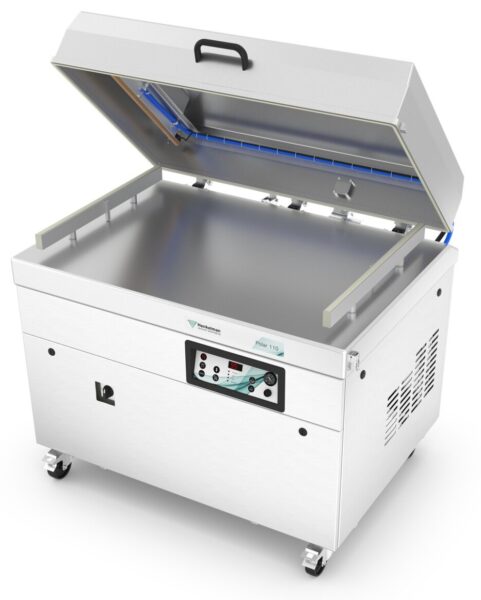 Rvs-uitgevoerd vloerkamermodel met vlakke werkplaat. Samen zorgt dit ervoor dat deze machine makkelijk te reinigen is. Verkrijgbaar in verschillende afmetingen, pompcapaciteiten en sealbalkconfiguraties.