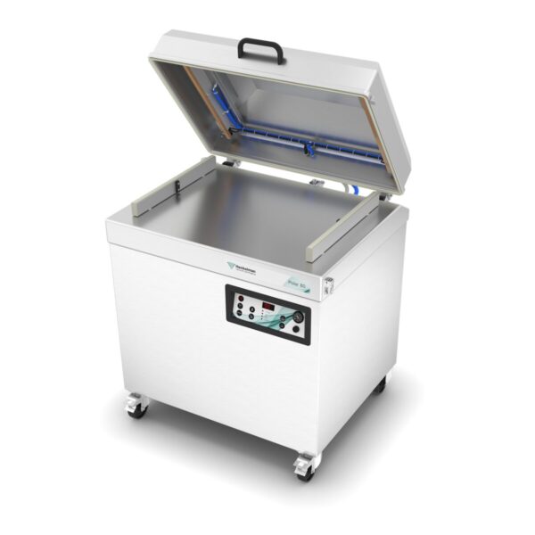 Rvs-uitgevoerd vloerkamermodel met vlakke werkplaat. Samen zorgt dit ervoor dat deze machine makkelijk te reinigen is. Verkrijgbaar in verschillende afmetingen, pompcapaciteiten en sealbalkconfiguraties. Machine afmetingen: 990 x 1200 x 1150 m [...]